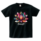 美しく咲く蓮の花と優しいスピリチュアルメッセージ “Namaste” を組み合わせた、極彩色のアートデザインTシャツ。