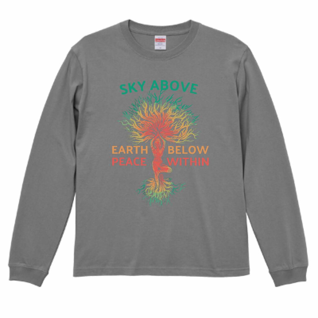自然調和ヨガ長袖Tシャツ|自然と調和するスピリチュアルデザイン|瞑想・心の安定・癒し|ストーングレー