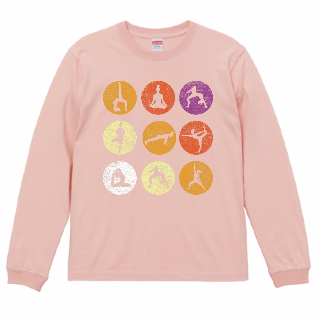 ヨガポーズ 9種シルエット 長袖Tシャツ|ヨガ・フィットネス・ピラティス|ビンテージ加工・おしゃれサークルデザイン|オフピンク