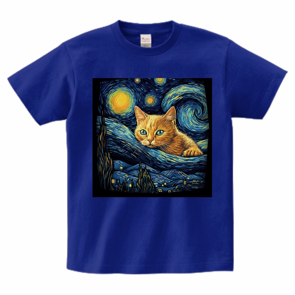星降る夜の猫 アートデザイン|名画風 猫イラスト Tシャツ・雑貨|星月夜オマージュ 猫アート|幻想的 猫イラスト|ジャパンブルー