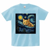 星降る夜の猫 アートデザイン|名画風 猫イラスト Tシャツ・雑貨|星月夜オマージュ 猫アート|幻想的 猫イラスト|ライトブルー