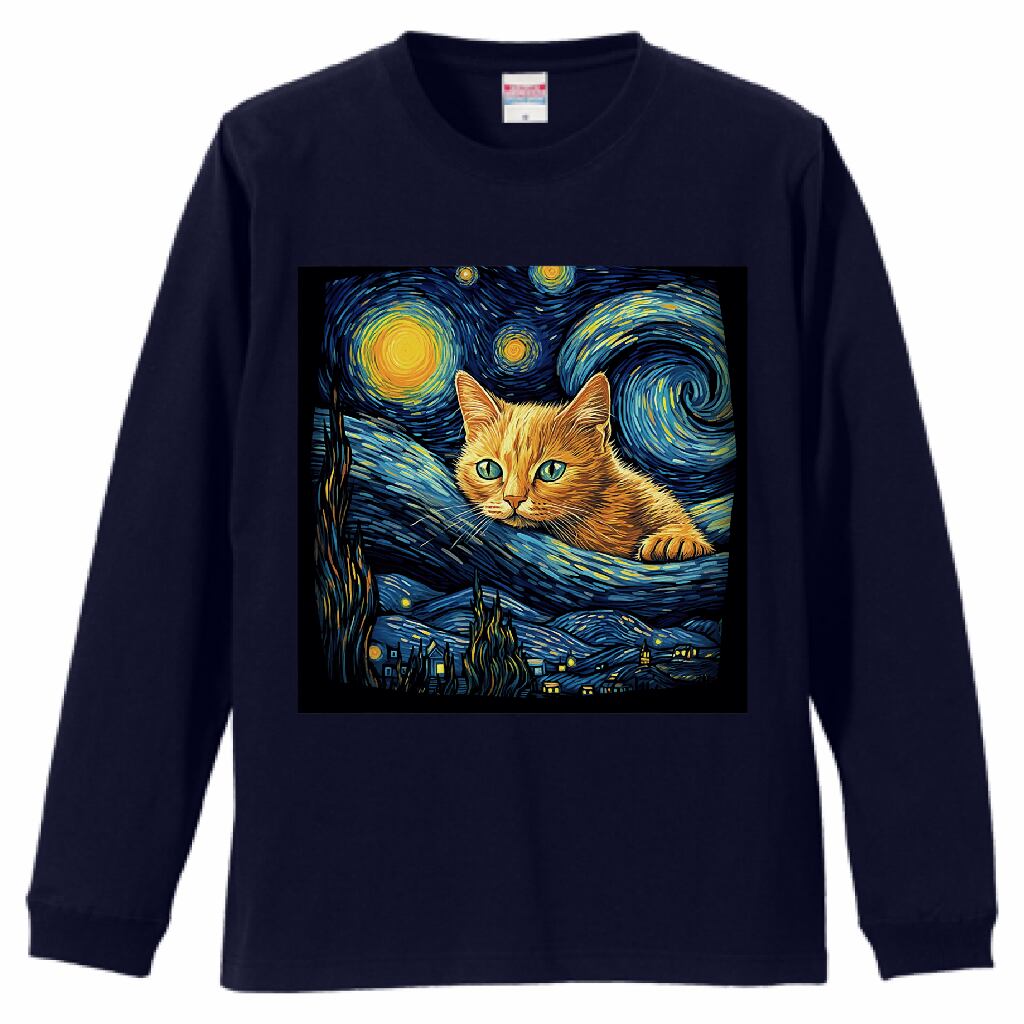 星降る夜の猫 アートデザイン|名画風 猫イラスト 長袖Tシャツ・雑貨|星月夜オマージュ 猫アート|幻想的 猫イラスト|ネイビー