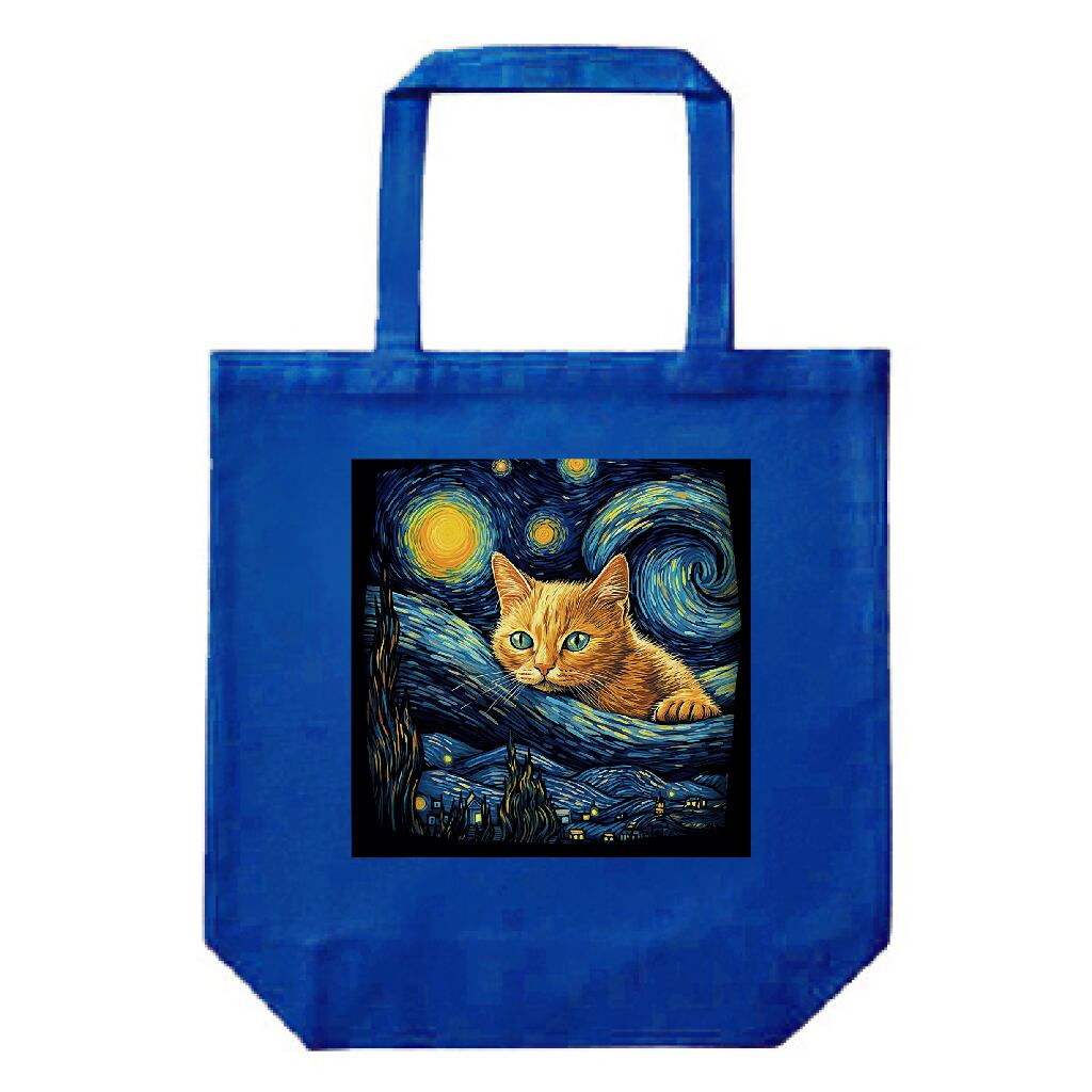 星降る夜の猫 アートデザイン|名画風 猫イラスト 12ozキャンバストートバッグ(M)|星月夜オマージュ 猫アート|幻想的 猫イラスト|ロイヤルブルー