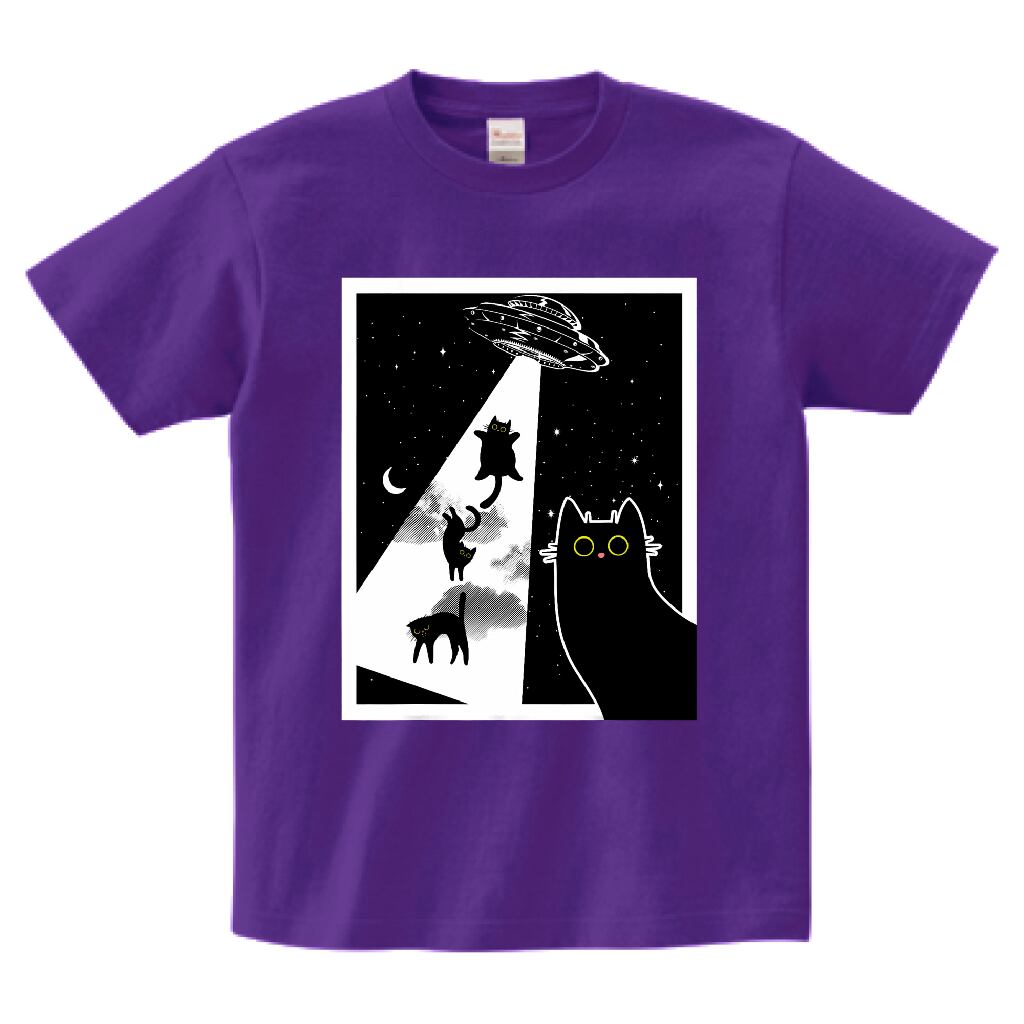 UFOにさらわれる黒猫 アートデザイン|猫イラスト・Tシャツ・雑貨|猫好き必見 宇宙と黒猫のイラスト|UFOアブダクション 猫アート|パープル
