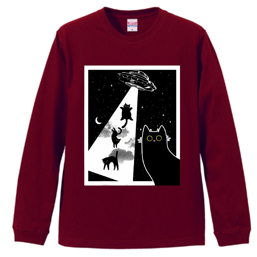 UFOにさらわれる黒猫 アートデザイン|猫イラスト・長袖Tシャツ・雑貨|猫好き必見 宇宙と黒猫のイラスト|UFOアブダクション 猫アート|バーガンディ