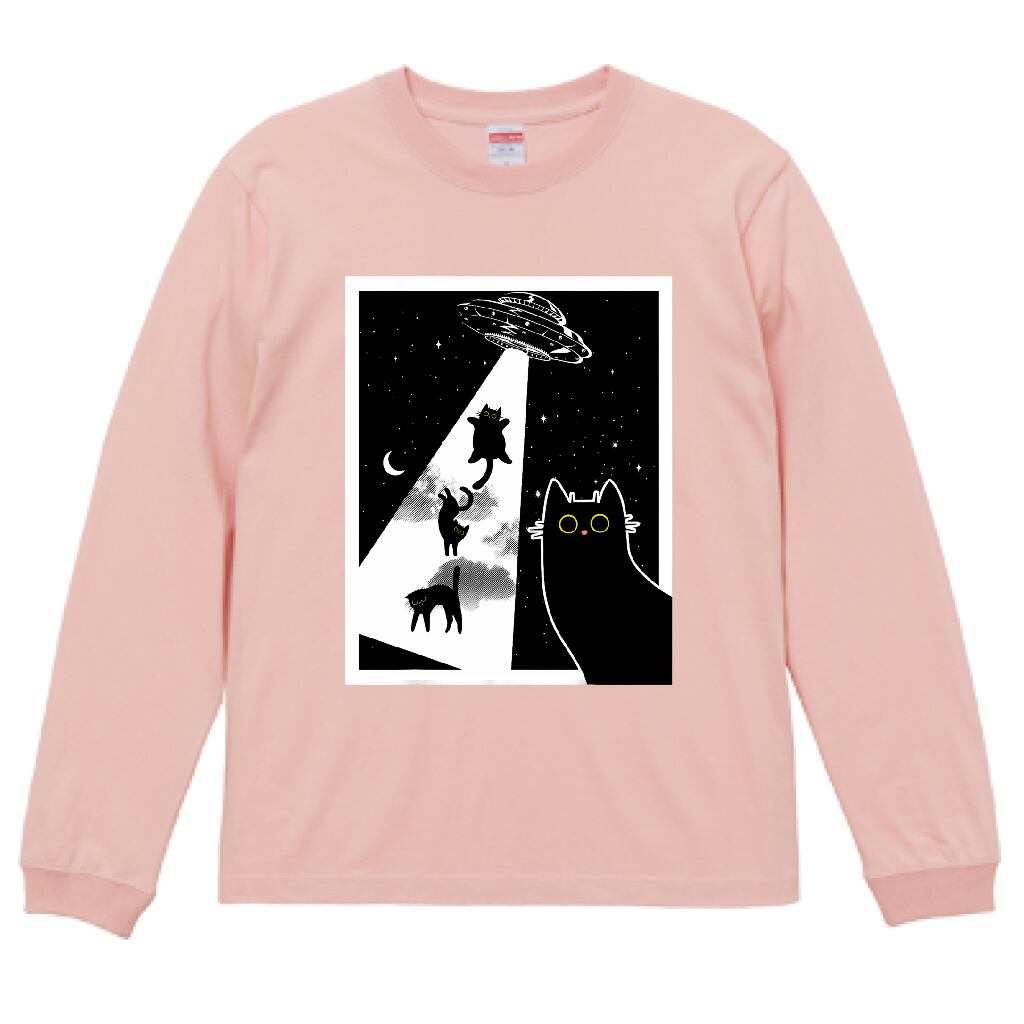 UFOにさらわれる黒猫 アートデザイン|猫イラスト・長袖Tシャツ・雑貨|猫好き必見 宇宙と黒猫のイラスト|UFOアブダクション 猫アート|オフピンク