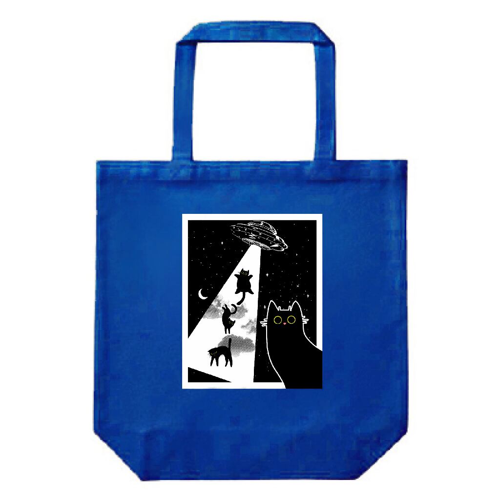 UFOにさらわれる黒猫 アートデザイン|猫イラスト・12ozキャンバストートバッグ(M)・雑貨|猫好き必見 宇宙と黒猫のイラスト|UFOアブダクション|ロイヤルブルー