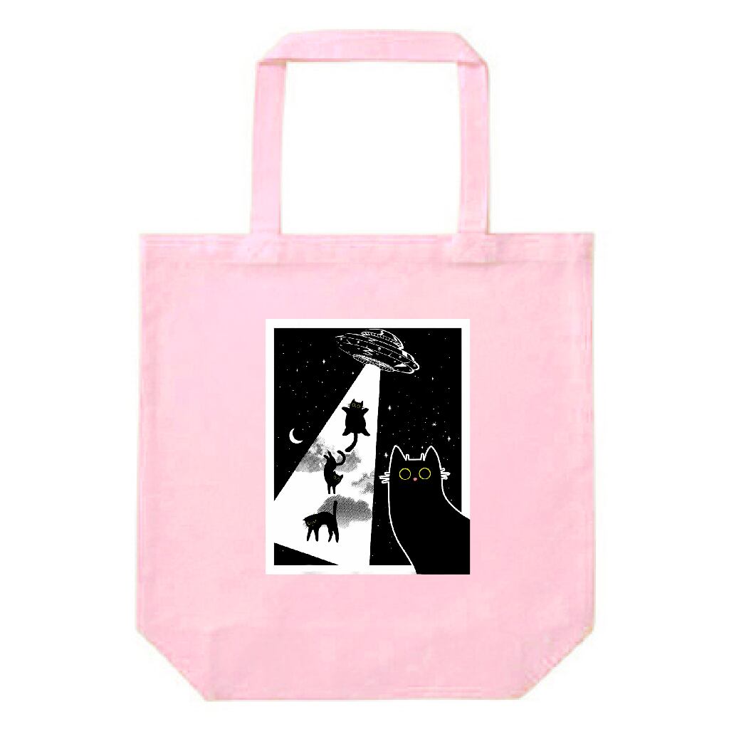 UFOにさらわれる黒猫 アートデザイン|猫イラスト・12ozキャンバストートバッグ(M)・雑貨|猫好き必見 宇宙と黒猫のイラスト|UFOアブダクション|ライトピンク